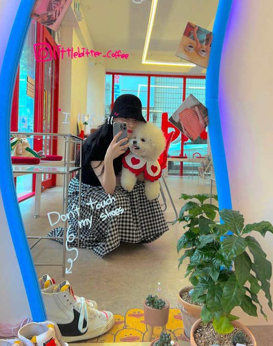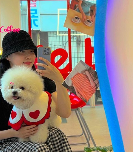 공개된 사진에는 김유지가 반려견과 함께 거울에 비친 자신을 촬영하는 모습이 담겨 있다.