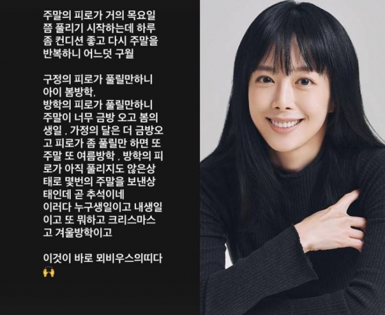 이어 "구정의 피로가 풀릴만하니 아이 봄방학. 방학의 피로가 풀릴만하니 주말이 너무 금방 오고 봄의 생일. 가정의 달은 더 금방 오고 피로가 좀 풀릴만하면 또 주말 또 여름방학. 방학의 피로가 아직 풀리지도 않은 상태로 몇 번의 주말을 보낸 상태인데 곧 추석이네"라고 적었다.