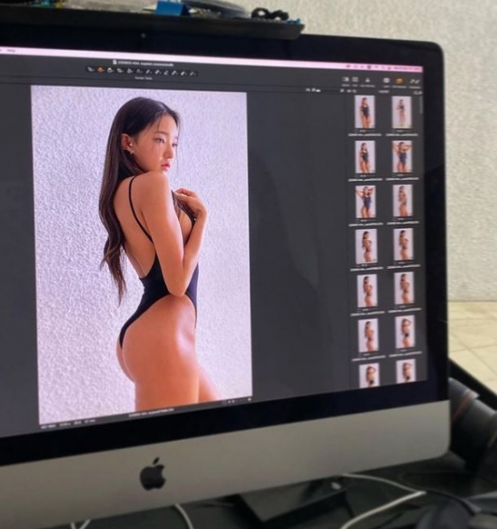 김주연은 "살이 많이 쪘었어서 완벽하지는 않아도 최선을 다해서 찍었다. 그래서 보디 슈트로 입었다. 엉댕이는 자신있지만 복근은 아직"이라고 설명했다.