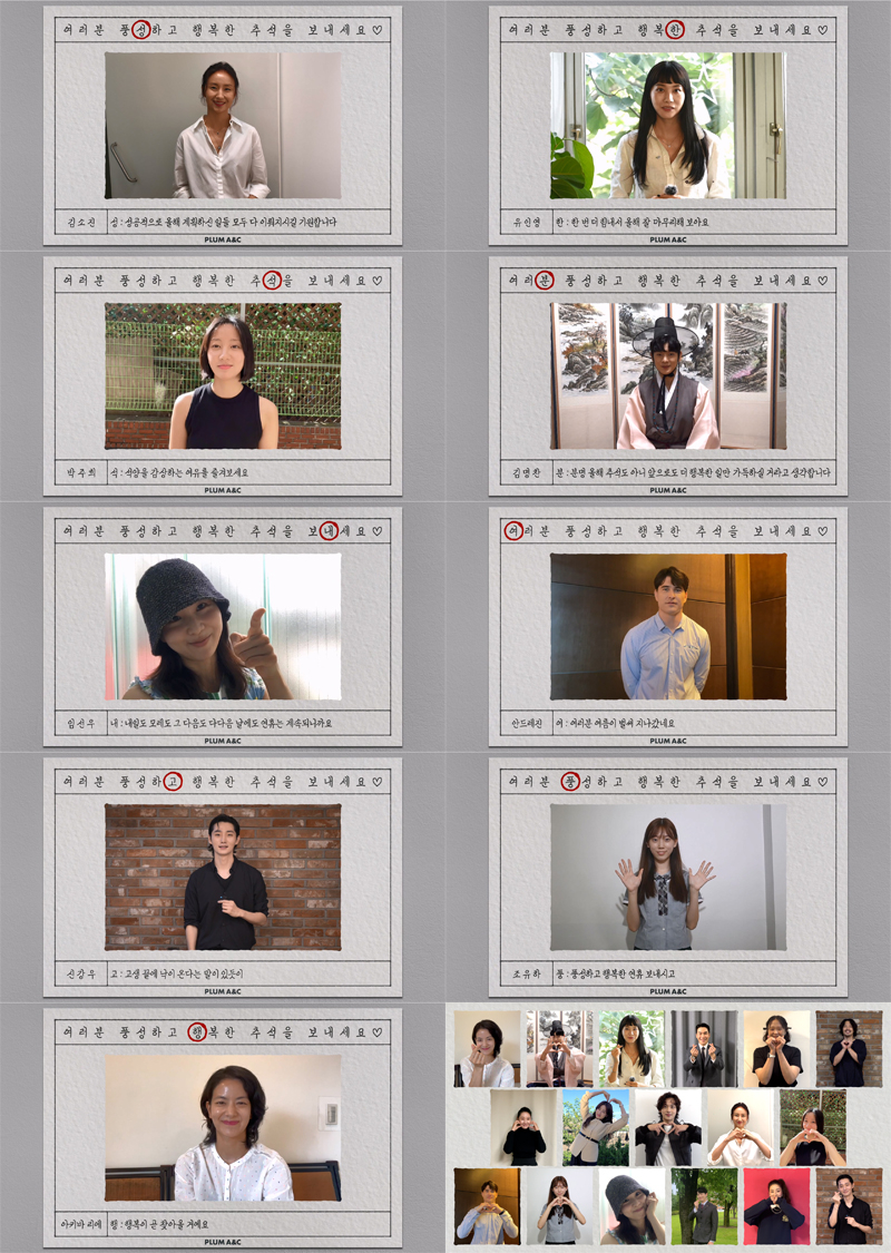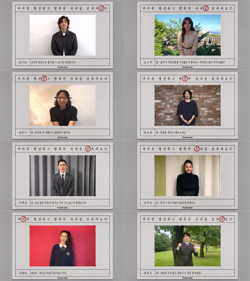 플럼에이앤씨는 8일 공식 유튜브 채널을 통해 소속 배우들의 추석 인사를 전했다. 배우들은 '여러분 풍성하고 행복한 추석을 보내세요' 제시 문장에 맞게 배우들이 릴레이로 N행시에 참여했다.