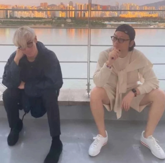 사진에서 탑과 이동휘는 한강을 배경으로 편안한 자세로 앉아 포즈를 취하고 있다.