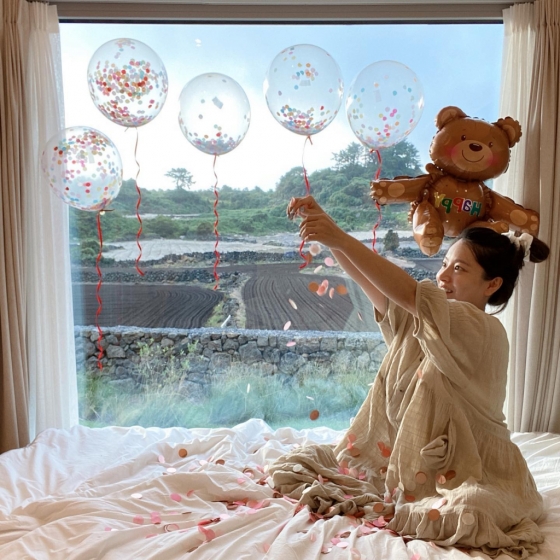 공개된 사진에는 아름다운 풍경이 인상적인 방 안에서 베이비샤워를 즐기고 있는 벤의 모습이 담겼다. 벤은 꽃가루를 던지거나 남편에게 뽀뽀를 하며 달달한 모습을 자랑했다.