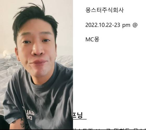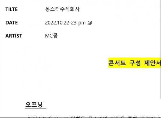 공개된 사진은 MC몽의 콘서트 구성 제안서로, 내용에는 '몽스터주식회사'란 제목, 2022년 10월 22일부터 23일까지 콘서트가 진행된다는 내용이 담겨 있었다.