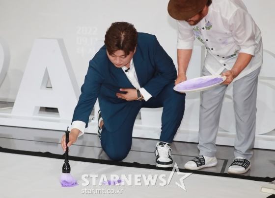 가수 김호중이 16일 오후 서울 성동구 성수동 갤러리아포레 더 서울라이티움에서 열린 2022 김호중 展 '별의 노래' 오픈 행사에서 그림을 그리고 있다.
