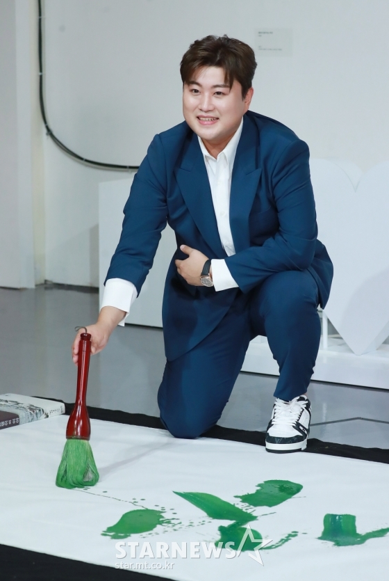 가수 김호중이 16일 오후 서울 성동구 성수동 갤러리아포레 더 서울라이티움에서 열린 2022 김호중 展 '별의 노래' 오픈 행사에서 그림을 그리고 있다.