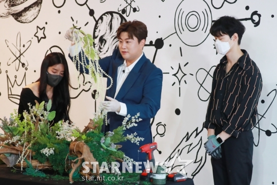 가수 김호중이 16일 오후 서울 성동구 성수동 갤러리아포레 더 서울라이티움에서 열린 2022 김호중 展 '별의 노래' 오픈 행사에서 꽃꽂이를 하고 있다.