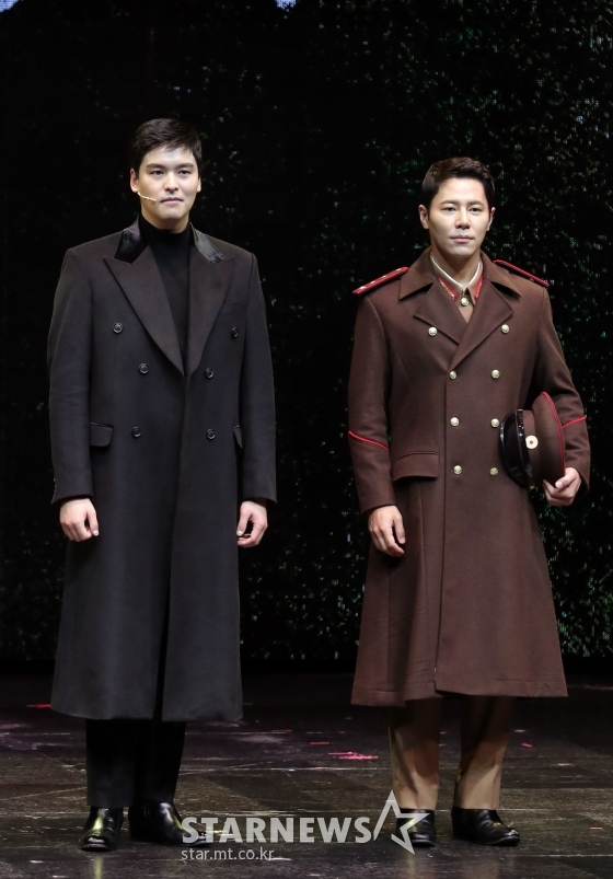 뮤지컬 배우 이장우, 이규형이 20일 오후 서울 강남구 삼성동 코엑스 아티움에서 열린 뮤지컬 '사랑의 불시착' 프레스콜에 참석해 포즈를 취하고 있다.