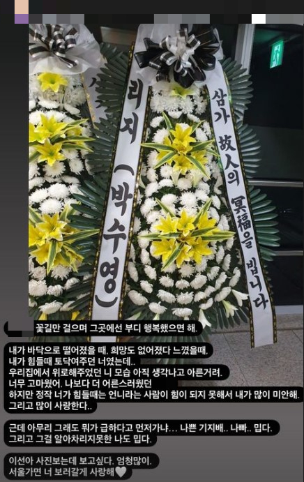 리지는 "꽃길만 걸으며 그곳에선 부디 행복했으면 해. 내가 바닥으로 떨어졌을 때. 희망도 없어졌다 느꼈을 때. 내가 힘들 때 토닥여주던 너였는데..우리 집에서 위로해주었던 네 모습 아직 생각나고 아른거려. 너무 고마웠어. 나보다 더 어른스러웠던. 하지만 정작 네가 힘들 때는 언니라는 사람이 힘이 되지 못해서 내가 많이 미안해. 그래도 많이 사랑한다"며 "근데 아무리 그래도 뭐가 급하다고 먼저 가냐…나쁜 기지배..나빠..밉다. 그리고 그걸 알아차리지 못한 나도 밉다. 사진 보는데 보고 싶다. 엄청 많이. 서울 가면 너 보러 갈게 사랑해"라고 적었다.