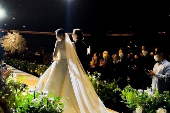 공개된 사진에는 결혼식장에서 행복한 미소를 짓고있는 넉살 부부의 모습이 담겼다. 특히 '성실씨'라는 별명을 가진 예비 신부의 아름다운 비주얼이 시선을 사로잡았다.