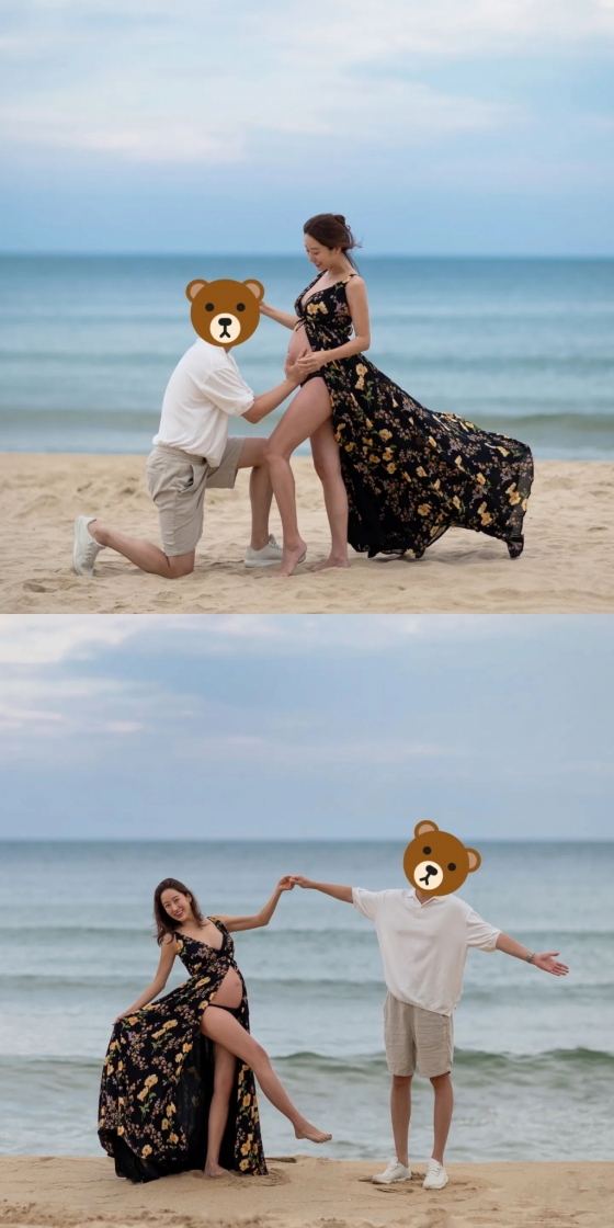 공개된 사진 속에는 강원도 양양의 죽도해변에서 꽃무늬 비키니를 입고 포즈를 취하고 있는 전혜빈의 모습이 담겨있다. 만삭인 그의 파격적인 비키니 자태가 눈길을 끄는 가운데 남편과의 다정한 포즈 또한 눈길을 끈다.