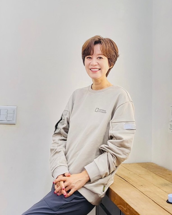공개된 사진에는 박미선이 환한 미소를 지으며 '원조 미녀 개그우먼'의 자태를 뽐내고 있다. 그녀가 밝힌 것처럼 아들의 옷을 입은 듯, 옷이 다소 여유가 있는 느낌이다.