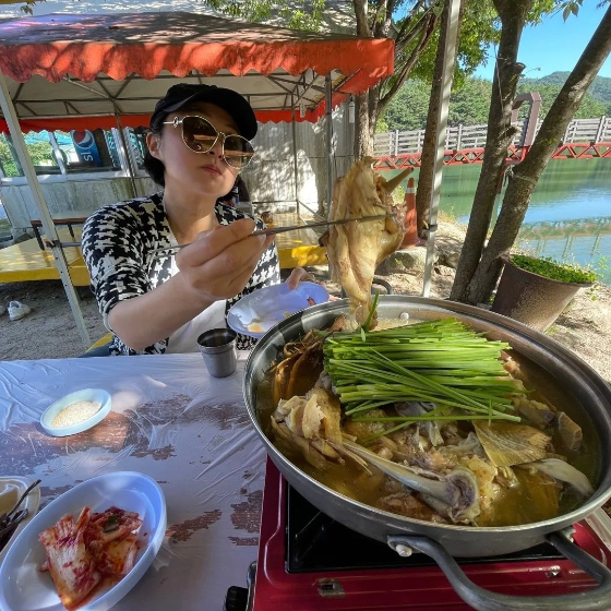 김현숙은 27일 자신의 인스타그램에 "산정호수. 신선이 따로 없구나. 몸보신. 아이고. 주은엄마 덕분에"라는 글과 여러 장의 사진을 게재했다.