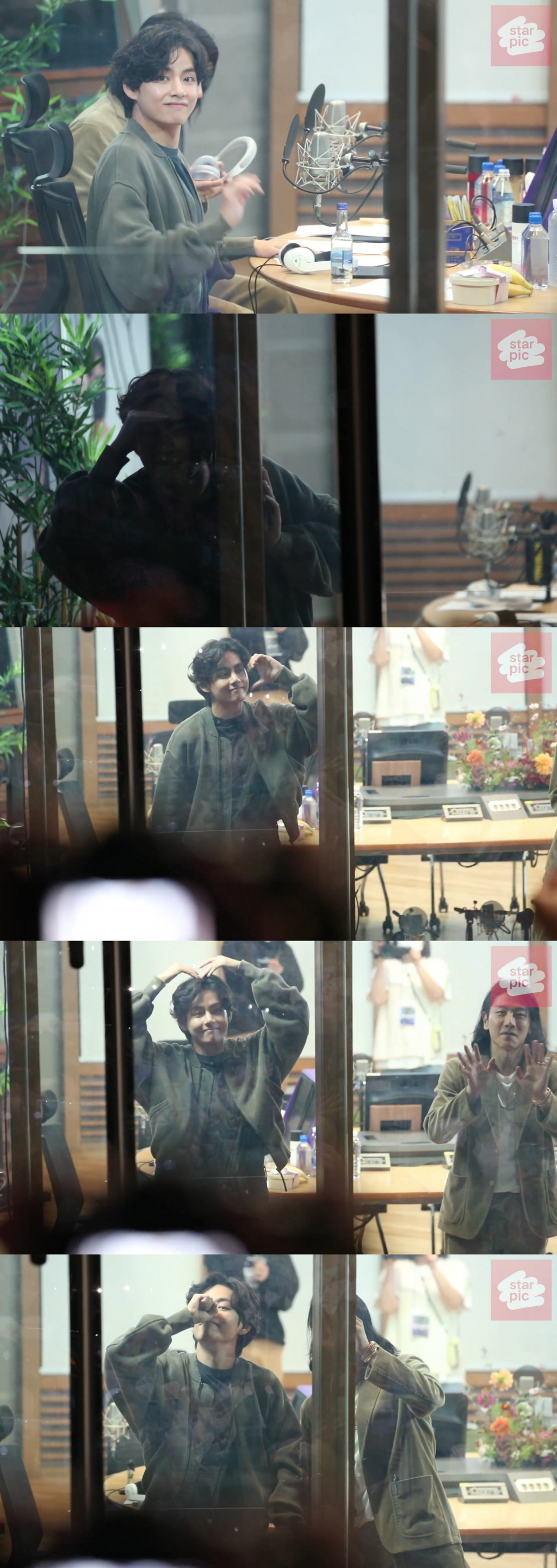 뷔는 방송 내내 유리벽 맞은편에 있는 팬들에게 하트를 만들어 보여주거나 손짓과 입모양으로 소통하며 애틋한 팬사랑을 전했다.