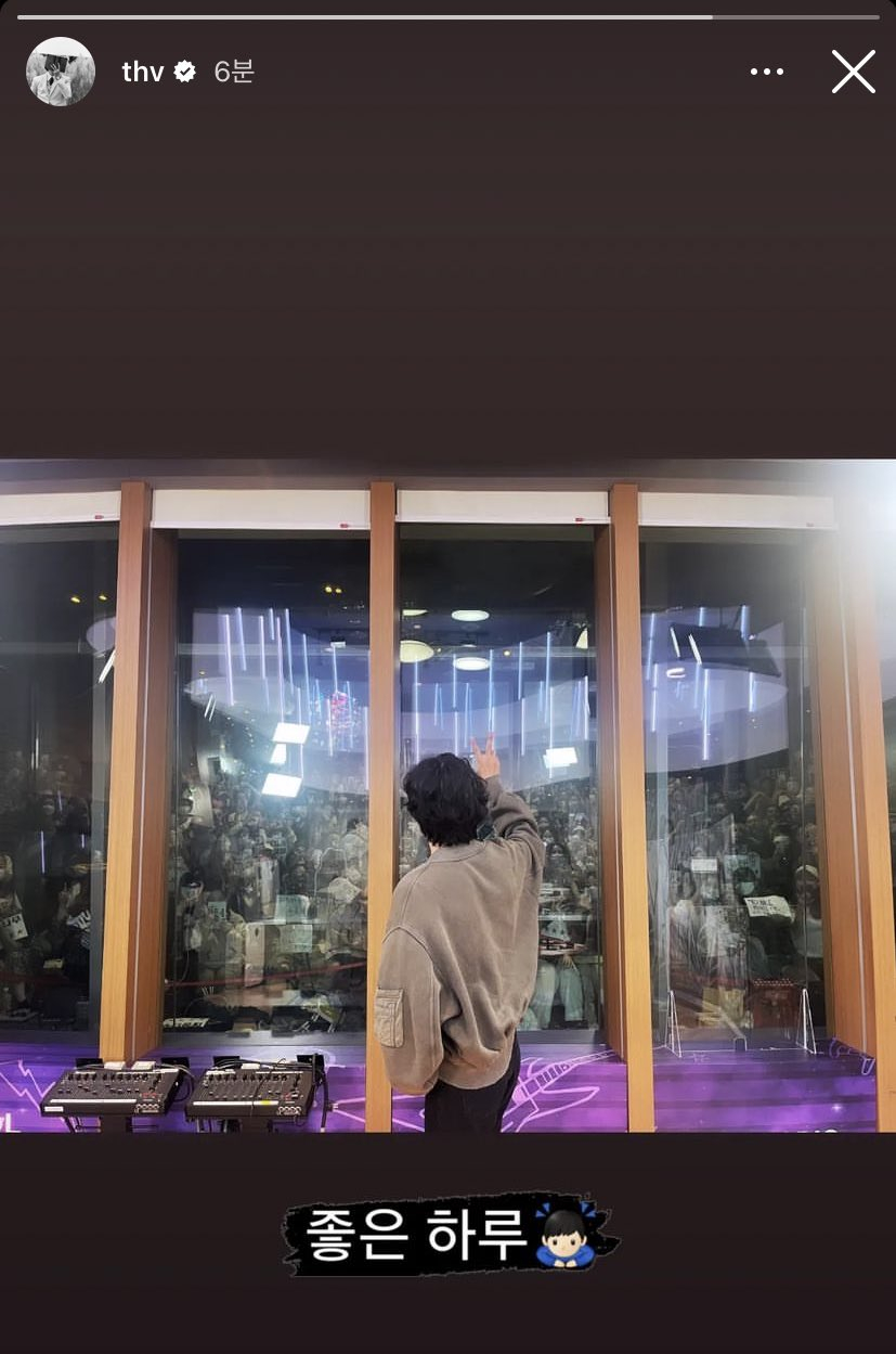 한편 첫날보다 더 많은 인파가 몰려 라디오 방송이 시작되기 반나절도 전에 이미 가든 스튜디오 밖에는 사람들로 붐볐고, 방송이 끝난 후 뷔는 자신의 인스타그램 스토리에 팬들과 함께 찍은 사진을 게재해 뜨거운 팬사랑을 보여줬다.