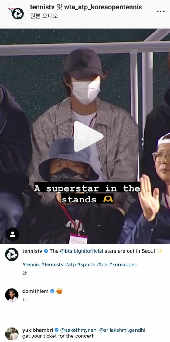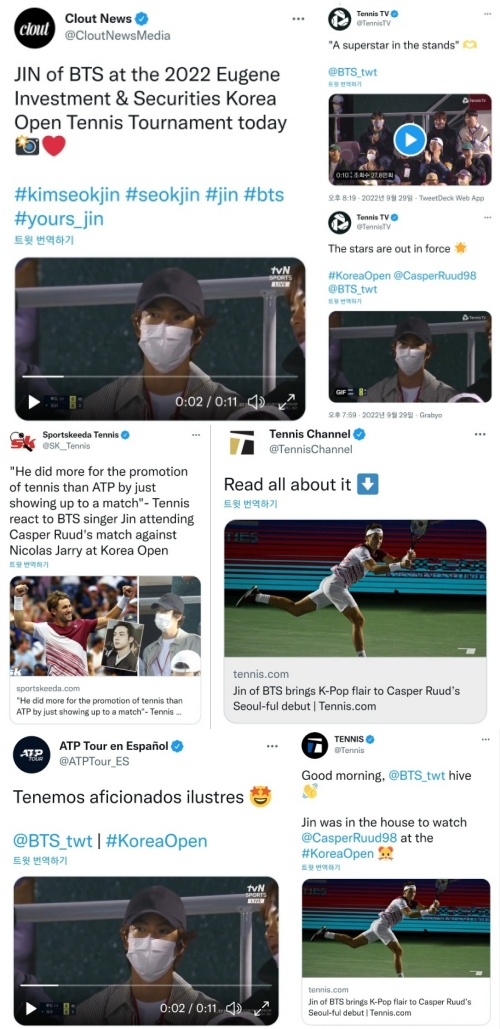 코리아 오픈 테니스 공식 계정은 진의 얼굴에 동그라미와 이모티콘을 표시해 게재하는 등 커다란 애정을 감추지 못하는 모습이었다.