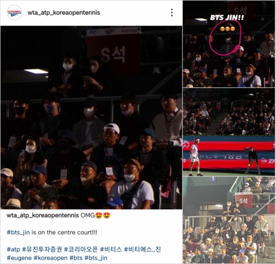 코리아 오픈 테니스 공식 계정(wta_atp_koreaopentennis)은 인스타그램 등 SNS를 통해 #bts_Jin is on the centre court!!! (방탄소년단 진이 센터코트에 있습니다!!!)라는 문구와 하트모양의 눈으로 웃는 이모티콘과 함께 진의 사진들을 게시했다.