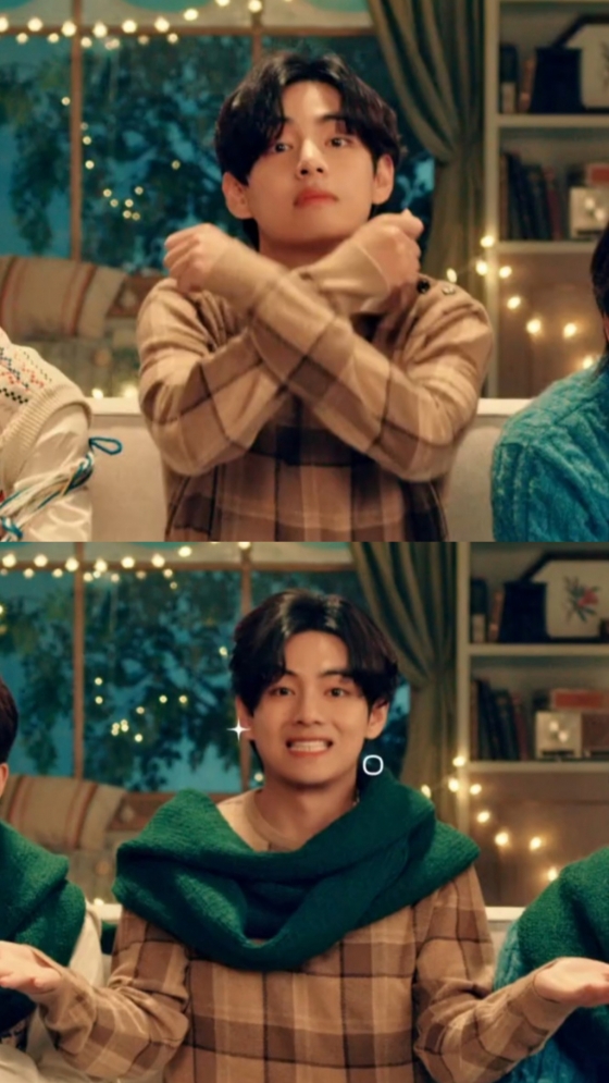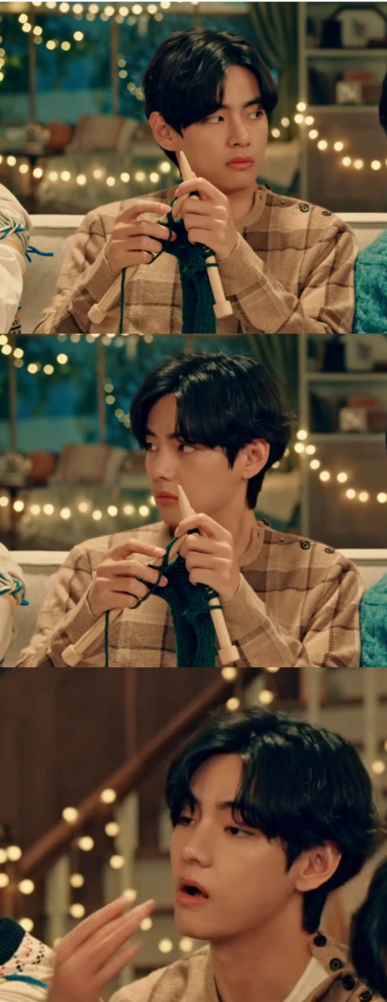 방탄소년단 멤버들이 각자 뜨개질하고 있는데 뷔 옆에 앉은 멤버들이 털실에 뒤엉켜 서로 밀고 당기면서 작은 소동이 일어나고 뷔가 손을 멈추고 그 모습을 쳐다본다.