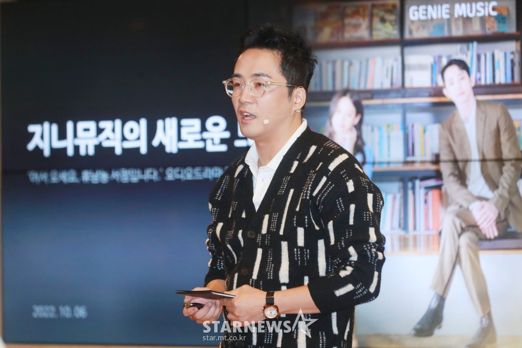 김정욱 지니뮤직 뉴비즈본부장이 6일 오전 서울 강남구 지니뮤직에서 진행된 AI 오디오 드라마 '어서 오세요, 휴남동 서점입니다' 제작발표회에서 발표를 하고 있다.