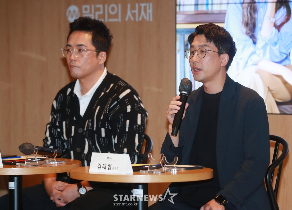 김태형 밀리의 서재 콘텐츠사업본부장(오른쪽), 김정욱 지니뮤직 뉴비즈본부장이 6일 오전 서울 강남구 지니뮤직에서 진행된 AI 오디오 드라마 '어서 오세요, 휴남동 서점입니다' 제작발표회에서 발표를 하고 있다.