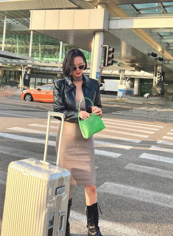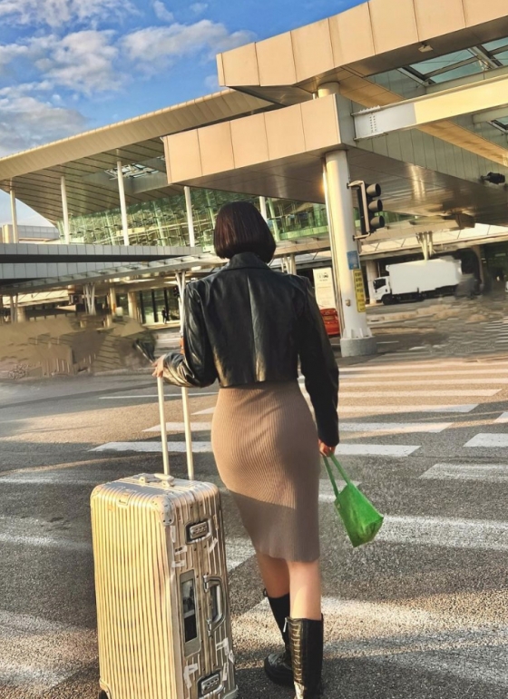 사진에서 지소연은 공항을 배경으로 크롭 가죽 재킷과 타이트한 니트 원피스, 가죽 롱부츠 등을 매치했다.