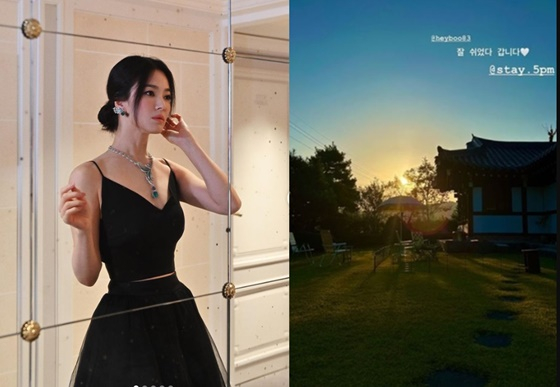 송혜교는 12일 자신의 인스타그램 스토리에 "잘 쉬었다 갑니다"라는 글과 사진을 게재했다.