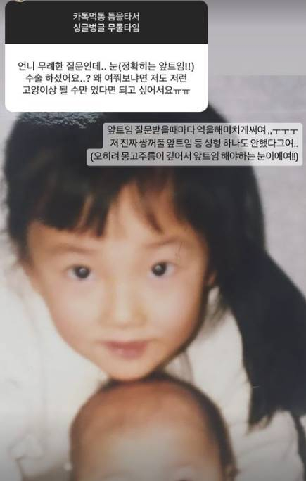 한 네티즌은 옥순에게 "언니 무례한 질문인데.. 눈(정확히는 앞트임!) 수술하셨어요? 저도 저런 고양이상 될 수만 있다면 되고 싶어서요"라고 질문했다.