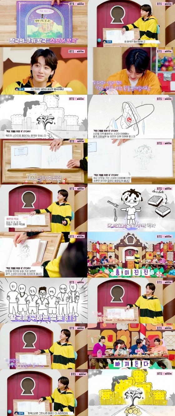 정국은 '스모어 왕국' 부제로 '작은 것들을 위한 국(작.것.국)'이라는 제목으로 구연동화를 만들어 눈길을 끌었다.