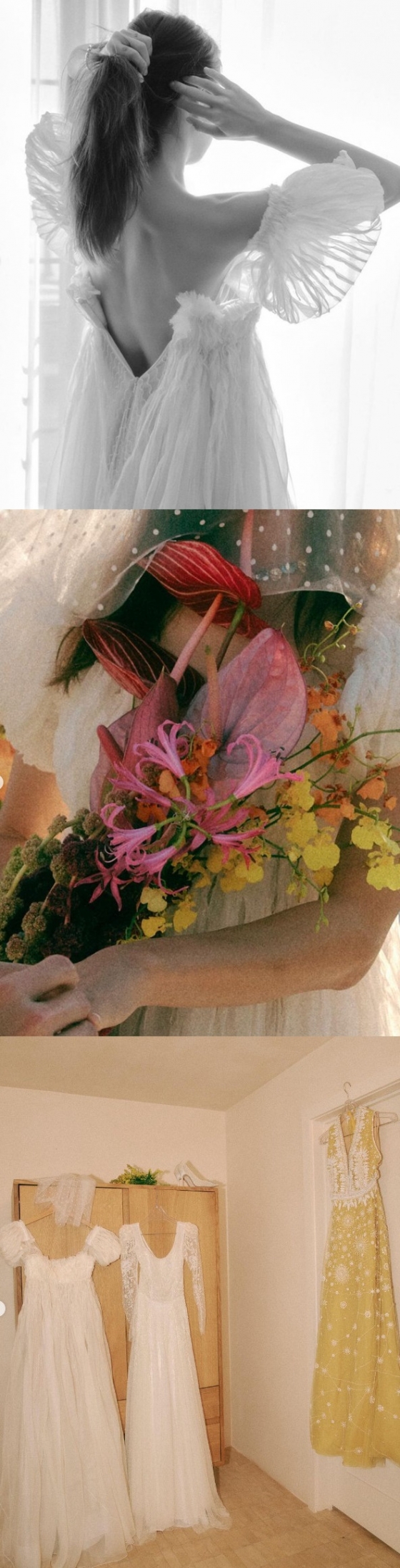 사진 속엔 웨딩 슈즈와 더불어 웨딩드레스 여러 벌이 이목을 끈다. 팔 부분이 다른 웨딩드레스는 공효진의 이미지와 잘 어우러진다. 또한 그는 직접 착용한 모습까지 공개해 이목을 끌어 당긴다.