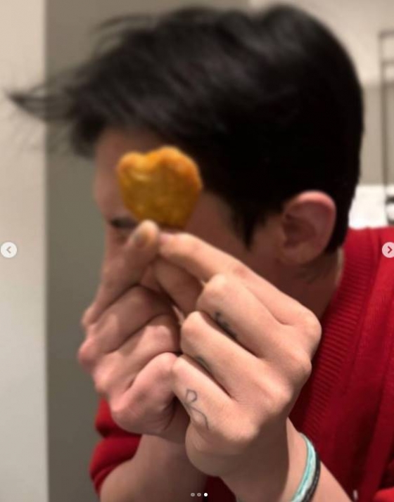 또 다른 속 그는 하트 모양 너겟을 들고 카메라를 향해 고백하는 듯한 포즈를 취했다.