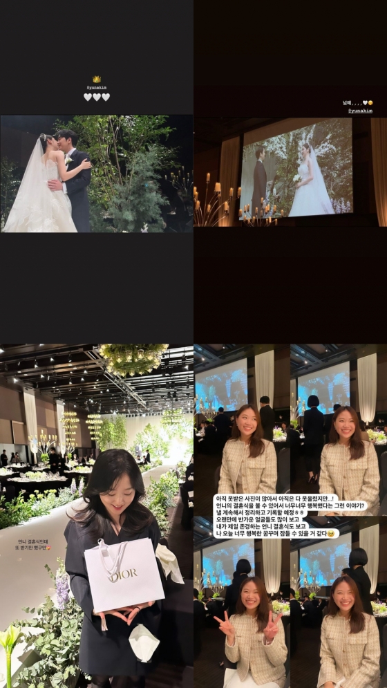 이어 김연아의 피겨 스케이팅 후배들이 총출동했다. 김해진은 결혼식장에서 찍은 사진을 다수 공개하며 "언니 너무 축하드려요. 행복하세요. 오랜만에 반가운 얼굴들도 많이 보고 내가 제일 존경하는 언니 결혼식도 보고 나 오늘 너무 행복한 꿈꾸며 잠들 수 있을 것 같다"고 했다.