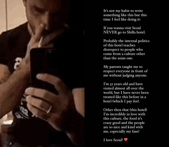 특히 미켈레 모로네는 "세계 대부분의 나라를 다녀봤지만, 내가 돈을 내고 묵은 호텔에서 이런 대접을 받는 건 처음이다. 이 호텔을 제외하면 난 이곳의 문화와 음식, 내게 멋지고 친절하게 대해준 사람들에게 사랑에 빠졌다. 서울을 사랑한다"고 말하며 호텔 측에 강한 불만을 드러냈다.