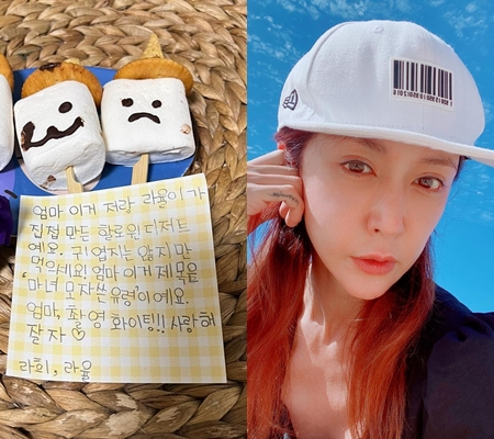 공개된 사진에는 딸 라희, 라율이 슈에게 선물한 디저트와 손 편지가 담겨있다. 슈의 두 딸은 '엄마 이거 저랑 라율이가 직접 만든 할로윈 디저트예요. 귀엽지는 않지만 먹으세요! 엄마 이거 제목은 '마녀 모자 쓴 유령'이에요. 엄마 촬영 파이팅! 사랑해 잘 자. 라희 라율'이라며 엄마를 응원했다.