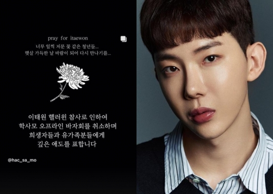 게재된 사진에는 흰색 국화꽃 한 송이와 "이태원 핼러윈 참사로 인하여 학사모 오프라인 바자회를 취소하며 희생자들과 유가족분들에게 깊은 애도를 표현합니다"라는 문구가 담겼다.