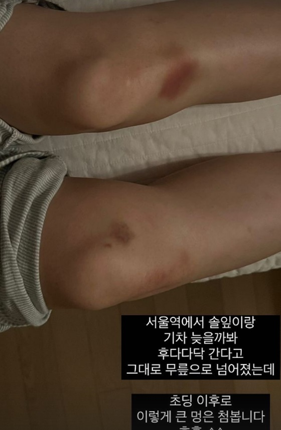 4일 유깻잎은 "서울역에서 솔잎이(딸)랑 기차 늦을까 봐 후다다닥 간다고 그대로 무릎으로 넘어졌는데. 초등학생 이후로 이렇게 큰 멍은 처음 본다"고 밝혔다.