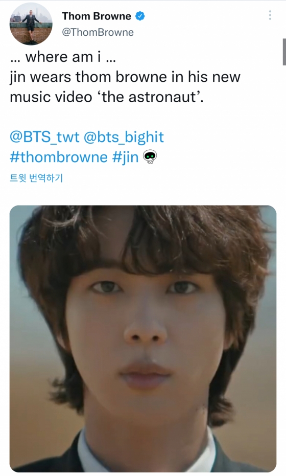 지난 5일 톰 브라운(Thom Browne) 트위터 공식 계정은 "...내가 지금 어디있는지... 진이 새로운 뮤직비디오 'The Astronaut' 에서 톰브라운 옷을 입고 있어요"라는 글과 함께 진의 'The Astronaut'(디 애스트로넛) 뮤직비디오의 부분 영상을 게재했다. 톰 브라운과 진의 해시 태그 또한 덧붙였다.