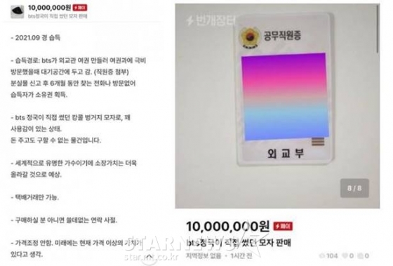 A씨는 지난달 17일 온라인 커뮤니티에는 중고거래 사이트 '번개장터'에 자신을 외교부 직원이라고 밝히며 'BTS 정국이 직접 썼던 모자 판매'란 제목으로 해당 모자의 판매가를 1000만 원으로 책정해 글을 올렸다.