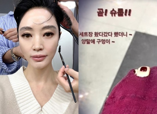 이에 대해 김혜수는 "세트장 왔다 갔다 했더니 양말에 구멍이"라고 설명했다.