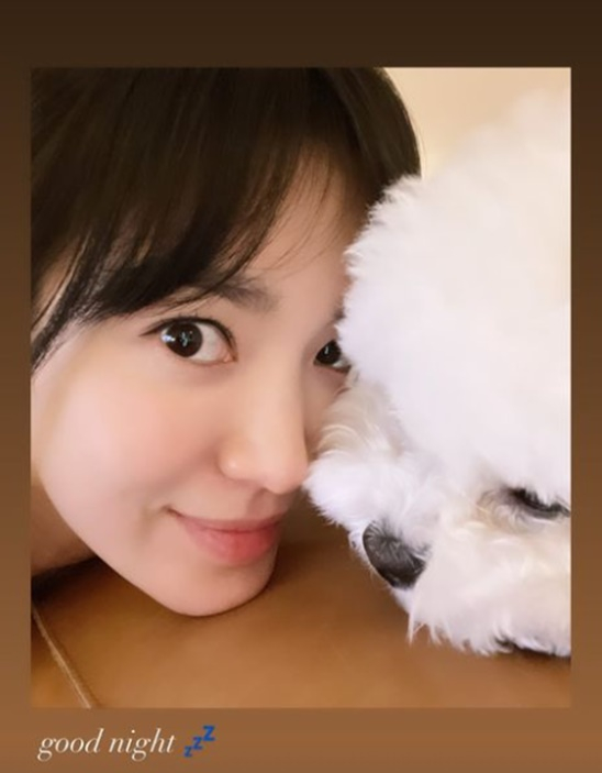 송혜교는 14일 "굿나잇"이라는 글과 사진을 공개했다. 사진 속 송혜교는 반려견 루비와 얼굴을 맞대고 셀카를 찍고 있다. 송혜교는 카메라를 향해 미소 짓고 있는 반면, 루비는 어딘가 삐진듯한 표정이 너무나 귀엽다. 그럼에도 송혜교와 얼굴을 가까이 맞대고 냄새를 맡고 있는 모습이다.