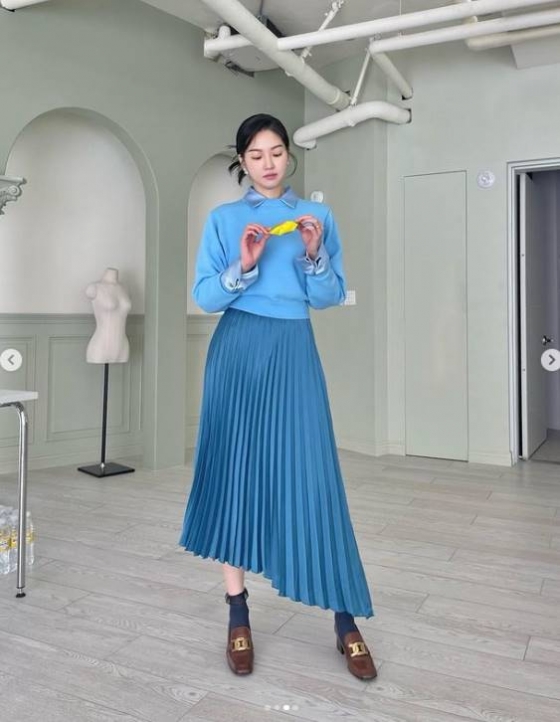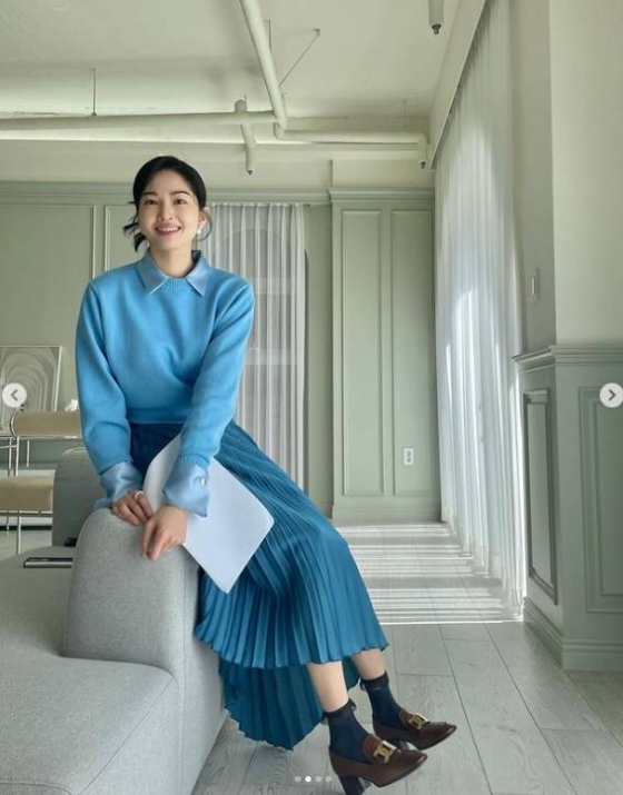 류이서는 사진 속에서 파란 셔츠에 파란 니트, 파란 스커트를 입고 방송 촬영을 하는 듯한 모습을 보여줬다.