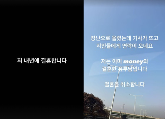 그러나 이는 곧 거짓으로 밝혀졌다. 수퍼비는 이날 "장난으로 올렸는데 기사가 뜨고 지인들에게 연락이 온다. 저는 이미 money(돈)와 결혼한 유부남이다. 결혼을 취소한다"고 설명했다.