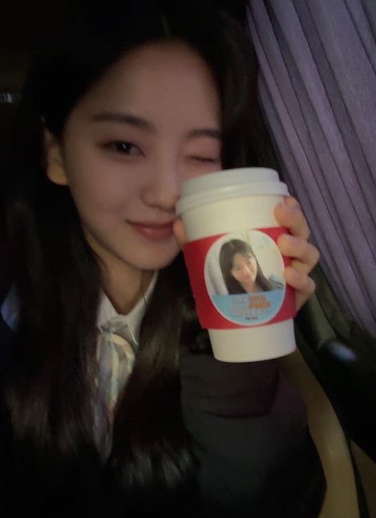 공개된 사진 속에는 조이현이 검은색 롱 패딩을 입고 한쪽 볼을 손으로 가린 채 커피차 앞에서 포즈를 취하는 모습이 담겼다. 또 다른 사진에서 그녀는 자신의 굿즈가 붙은 음료 컵을 들고 윙크를 하며 상큼한 매력을 뽐냈다.