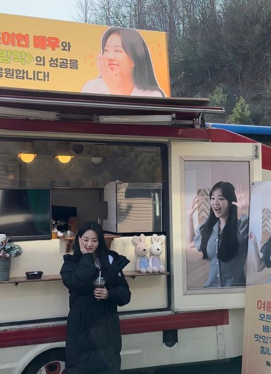 배우 조이현이 상큼한 매력과 함께 선물 받은 커피차를 인증했다.