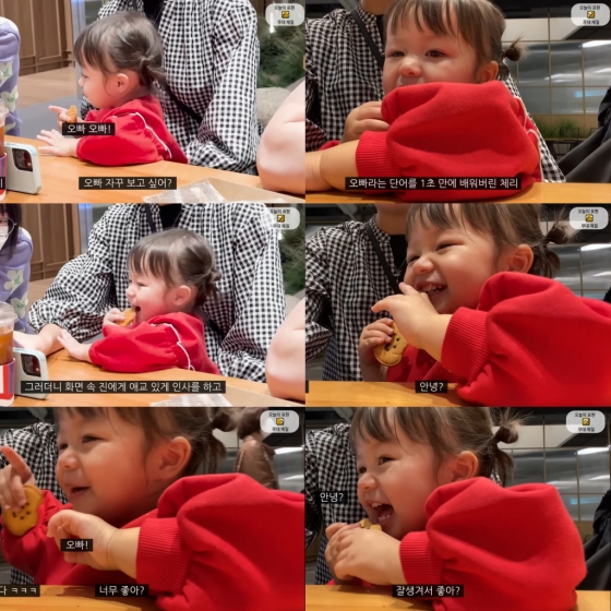 올리버쌤은 웃으며 "오빠라는 단어를 1초 만에 배워버린 체리. 그러더니 화면 속 진에게 애교 있게 인사를 하고"라고 설명했다. 체리는 연신 진을 오빠!라고 불렀다.