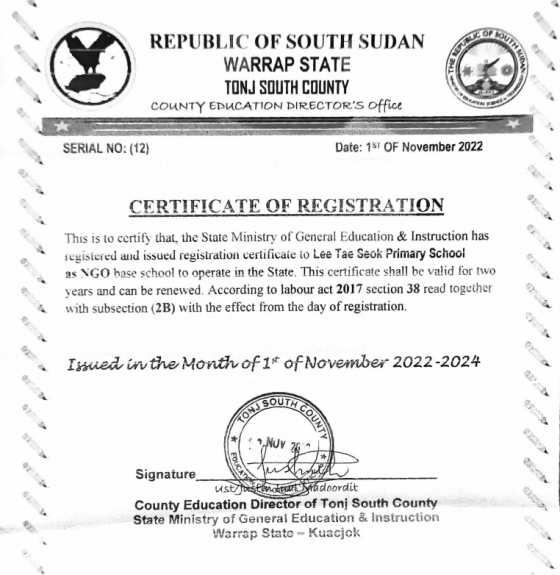 이태석 초등학교의 시작은 어느 공립 초등학교로 돌아간다. 남수단 정부의 어려움으로 예산지원이 중단돼 문을 닫은 공립 초등학교를 보고 (사)이태석 재단은 직접 운영하겠다는 제안을 남수단 와랍주에 넣었고, 이를 받아들이며 초등학교가 열리게 된 것이다. 교사의 월급, 학습기자재, 학비는 재단이 지원하고 대신 학교이름을 이태석 초등학교로 변경하는 조건이었다.