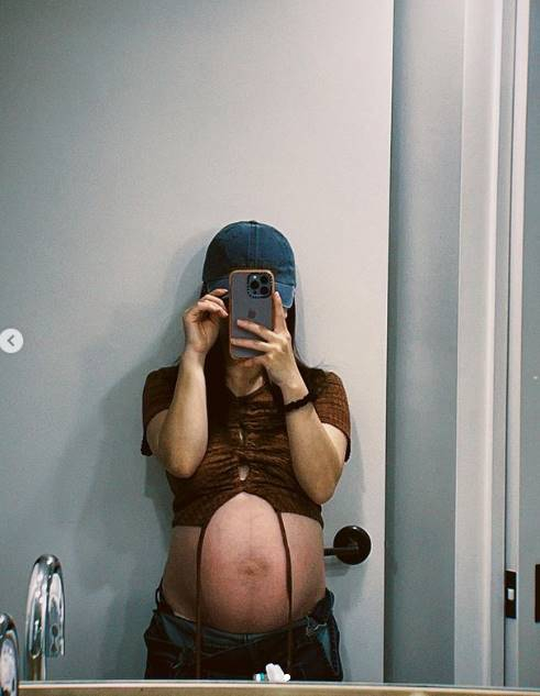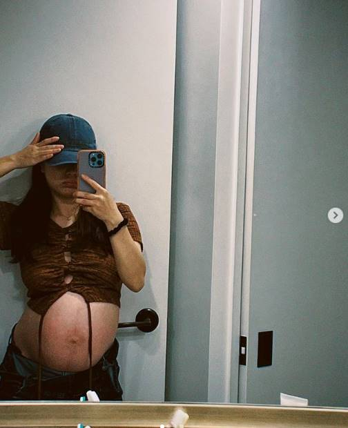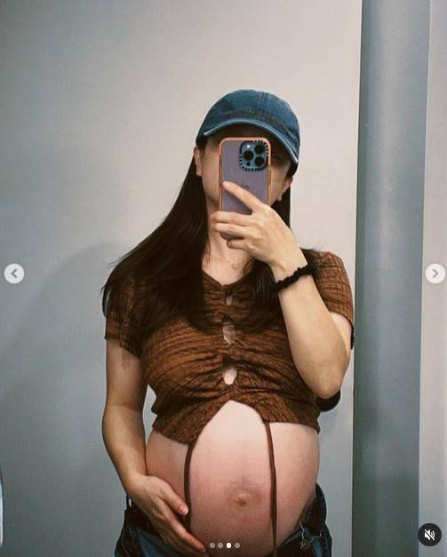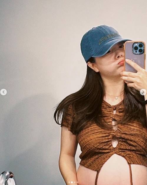 벤은 크롭티를 입고 만삭의 D라인을 보여주며 셀카를 촬영했다. 최근 만삭화보를 공개한 적 있는 자신감 있는 모습이다.