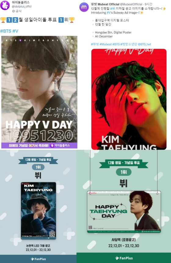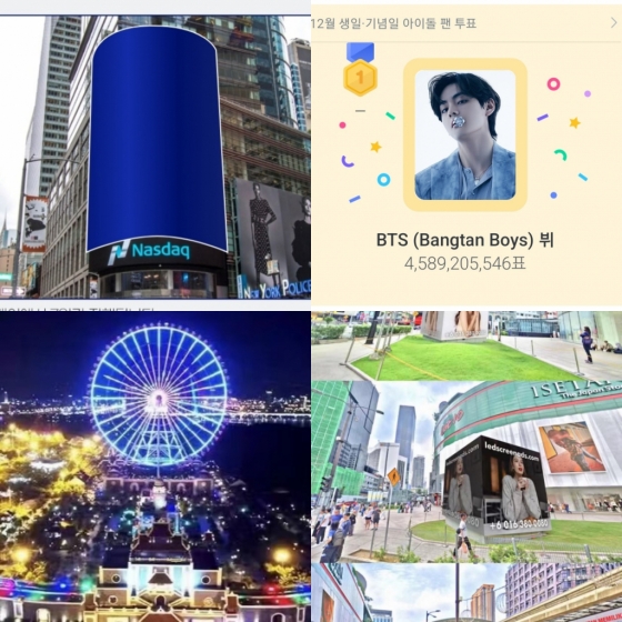서울에서는 더 다양한 광고가 진행된다. 12월 각종 생일투표에서 뷔가 1위를 휩쓸며 수차례 보상을 획득했기 때문. 뷔는 '팬플러스'에 이어 'Mubeat', 'UPICK', 'Idolplus', '최애돌', '아이돌차트'에서 진행된 12월 생일 투표에서 모두 1위에 오르는 압도적인 인기를 과시했다.