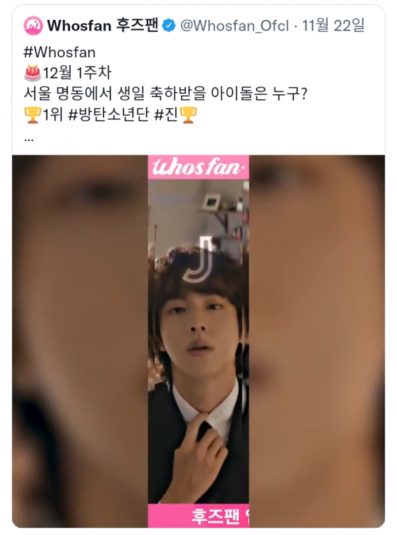 '후즈팬'에서는 생일을 맞는 케이팝 아티스트들을 위해 뉴욕 타임스퀘어 대형 전광판, 명동 레드아이 전광판 광고를 놓고 매주 글로벌 팬들의 투표를 진행하고 있다. 롯데백화점 바로 앞 명동길 입구에 위치한 레드아이 전광판 광고는 진의 다채로운 매력과 수려한 모습을 담아 팬들이 직접 제작한 영상으로 의미를 더했다.