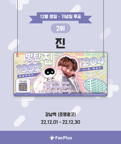 지난 한달간 진행된 팬플러스 12월 생일·기념일 연예인 팬 투표에서 진은 42억 표라는 높은 득표수로 2위를 차지해 12월 1일부터 12월 30일까지 강남역(신분당선) 3번출구에서 대형 조명 광고가 한달간 진행될 예정이다.