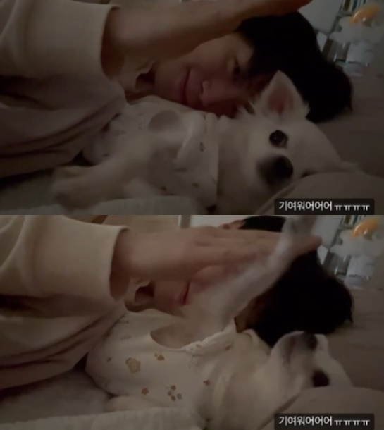 공개 된 영상 속에는 침대에 누워서 다정하게 놀고 있는 황바울과 강아지의 모습이 담겼다. 간미연은 그런 모습을 사랑스럽게 보는듯 하다.
