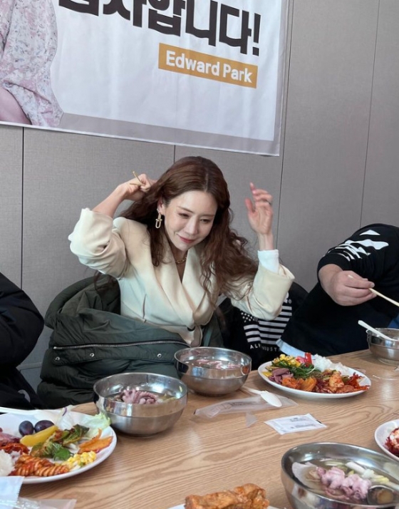 사진 속엔 "배우&스태프 여러분 힘내세요. 황금주 화이팅"이라는 문구가 적힌 남편의 응원이 담겨있다. 김정은은 행복한 미소를 지으며 남편이 서프라이즈 선물로 준 밥을 맛있게 먹고 있다.
